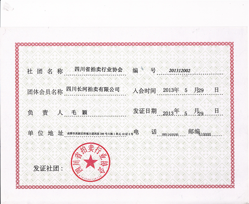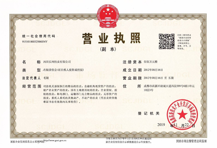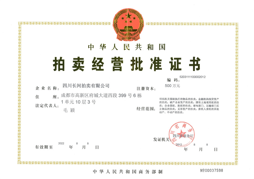 四川长河拍卖有限公司是经四川省商务厅批准,在成都市工商行政管理局登记注册的专业拍卖企业,注册资金五百万元人民币,实缴资金三百万元人民币。公司主要承接以下业务:国有资产的拍卖;司法机关强制执行的物品的拍卖;国家机关罚没、查封、扣押物品的拍卖;金融机构抵贷资产的拍卖;破产企业资产的拍卖;国有土地使用权的拍卖;矿产资源开采权的拍卖;企业债权、股权的拍卖;机动车的拍卖;邮电部门、运输部门无主物品的拍卖;各类有形和无形资产的拍卖;委托人委托的其他动产、不动产的拍卖。
